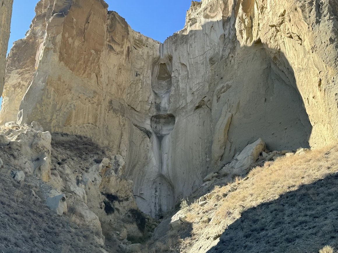 ![]() 太古の滝の跡 ・・・ 水が豊富だった頃、崖の上から水が流れ 3段の滝となり 浸食によってできた と推測 知床に同じ様な滝があった。 |