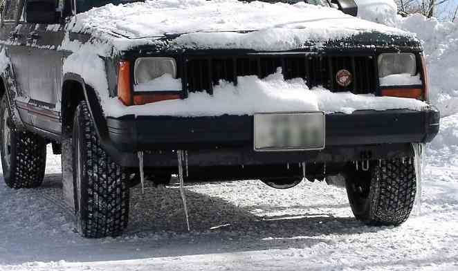 | 一晩で出来た、バンパーから、長いヒゲの様なつららを付け、元気に走る |