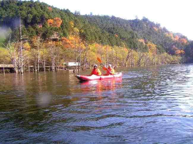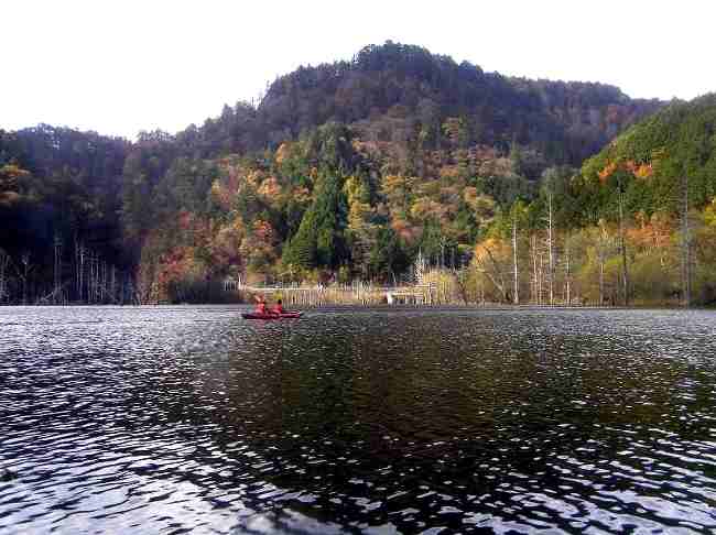 01 御岳自然湖へ漕ぎ出す、先客がいる。 カメラマン達から、やっと解放され、漕ぎ出す。 舟を止めて、釣りをする人も、わかさぎを狙っているそうだ |