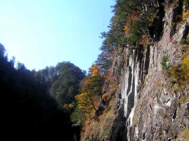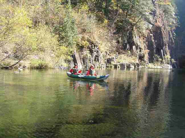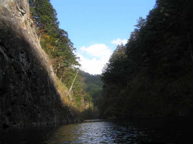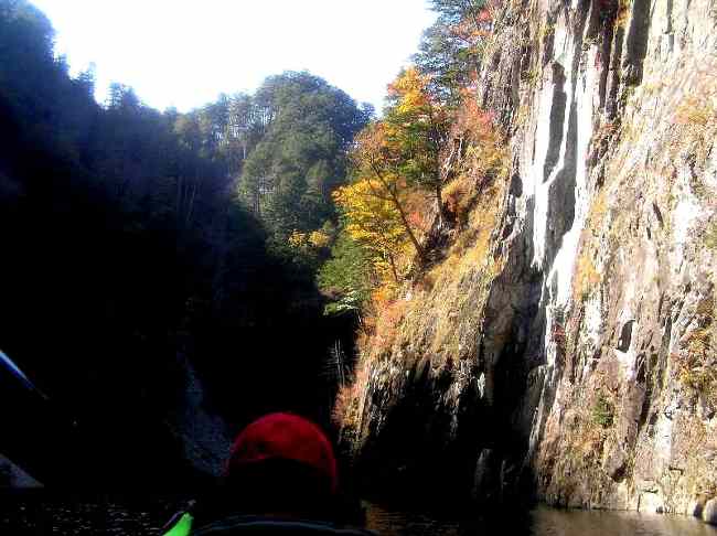 08 断崖沿いを漕ぐ友人、「落石注意〜!」 慌てて、戻る。 断崖絶壁なので、落石の可能性があり、 岸に近づきすぎては、危険なのである。 |
