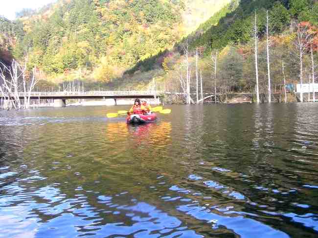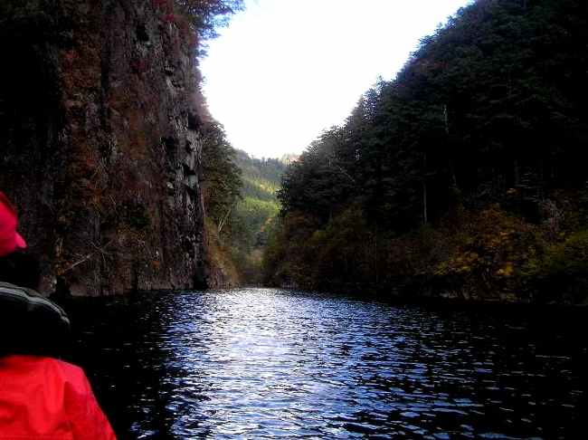 23 最下流、土石流で出来たダム' 湖の色は、黒色に近く見えるが、峡谷で、湖も深い為、光が入らないのである。 |