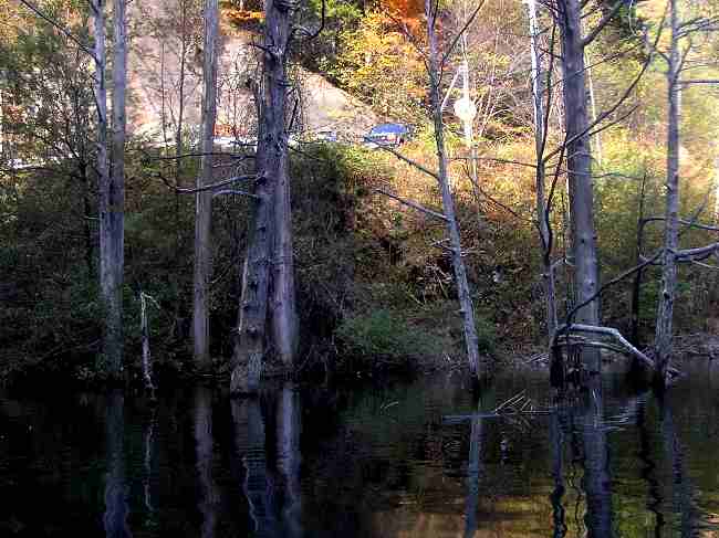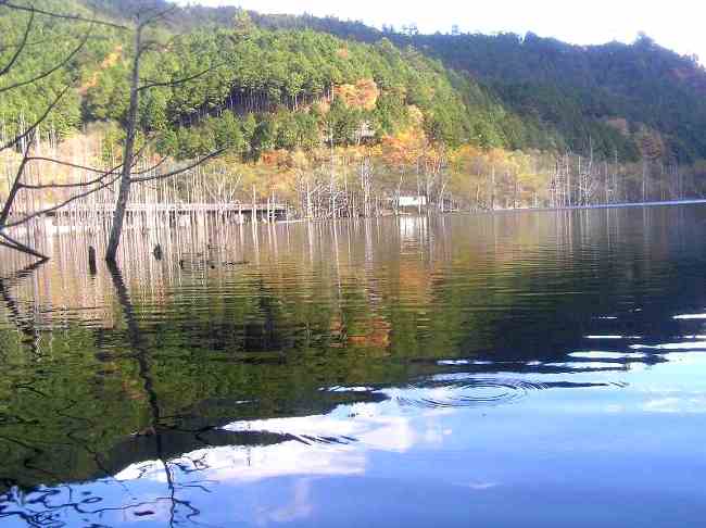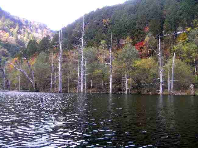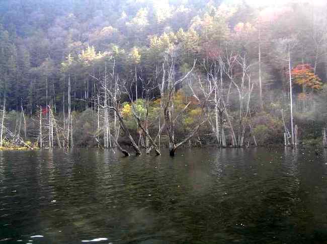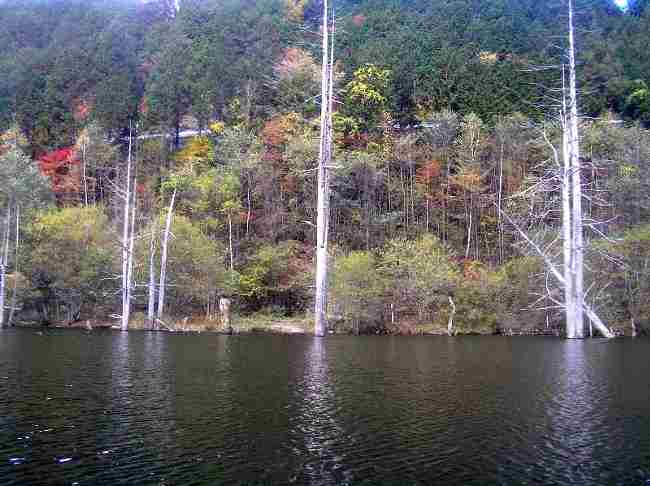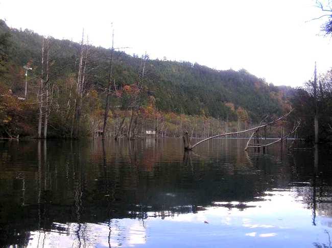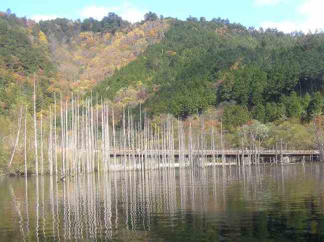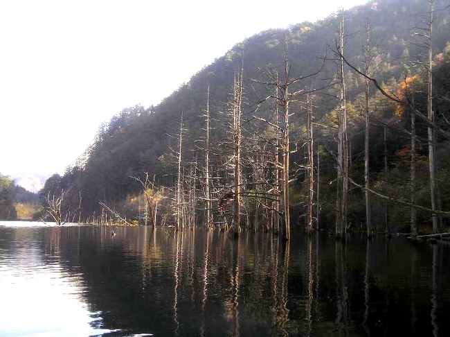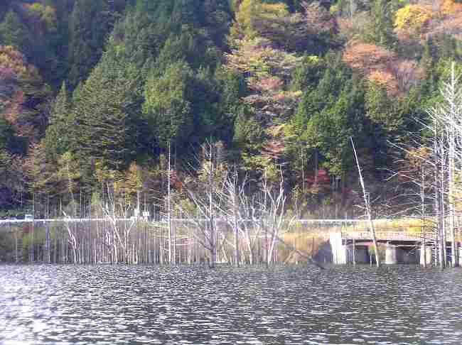 18 立ち枯れの樹々と、水没した、旧道の橋 |