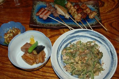 島ラッキョウ、ゴーヤーチャンプル、ラフティー、 串焼き 美味かった〜。 |