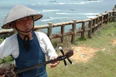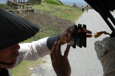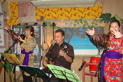 途中、 では唄を歌いますと、 客にサンバをたたかせ、 三線で、唄いだす。