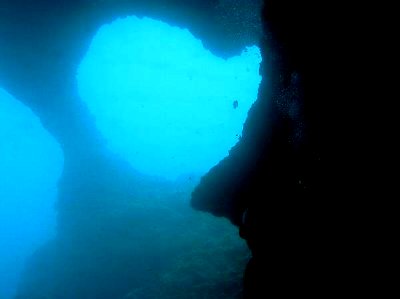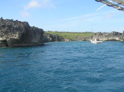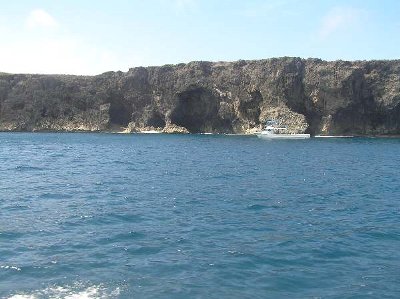![]() 洞穴が、あちらこちらにある。 戦時には、特攻艇の基地として使われたと、船長の談 |