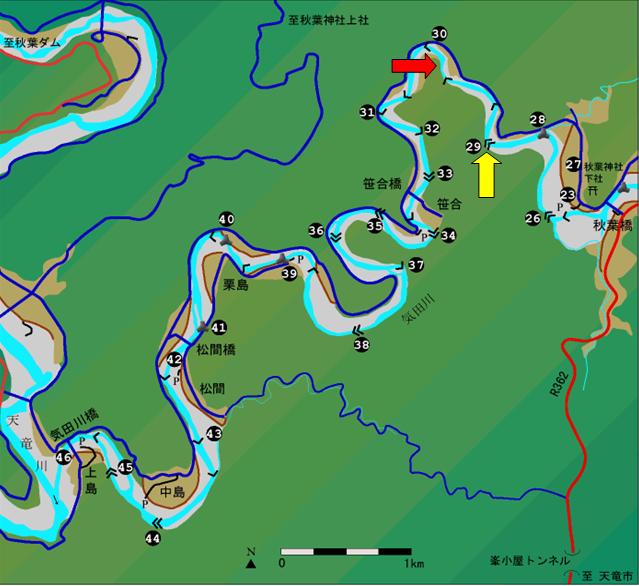 | 黄色矢印、 直角カーブて、轟沈 赤色矢印 の岸にようやく上陸 気田川パドリングガイド さんの 地図を借用 加工しました。 |