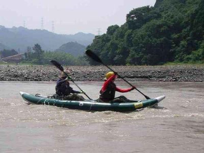 | ☆素浪人Uの報告。 . 到着時気温 27度。 国道を左に折れ キャンプ場に入る橋の上。 川を見ると 私達の知らない表情の気田川があった。 川幅いっぱいの水量 しかも泥水。 北側に視線を移すと壁に当たる激しい水量に白波が高く立つ。 心にざわざわと波が立ち 上昇した気温のせいか汗がつっーと流れ落ちた。 いよいよ 初めての表情を見せる川に挑む。 次々と艇の中に 飛び込む水は 私の足元に砂を残して セルフベイラーから排出される。 緊張して望んだ最初の荒波を越えて ほっとした空気が二人の間に流れた。 . 次の瀬でも 波の一番高いところを狙い果敢にパドルを入れる。 思った以上のスピードで 壁に吸い込まれる。 最初の波を乗り切った心の油断に 横波が強い力で覆いかぶさった。 左舷が大きく持ち上がり 右舷から泥水が大量に浸入した その瞬間景色が変わった。 . 投げ出し防止のために取り付けたレッグストラップから足が抜けない。 水が口に入った。視界が真っ暗。一瞬の出来事が私を襲う。 次の瞬間 水面に出ようとすると艇が頭上に。 手で押しのけて 水面に出る。 激流の向こうに艇を挟んで 信頼できるバディの顔を見て一安心。 さらに レスキューのカナディアンが近づいてきた。 . 思った以上に 水のパワーが強大で 大波に頭から洗礼を受けるなどして しばらくそのまま流された。 やっと 岸にたどり着いた時は ヨロヨロ、ヘロヘロ、ボロボロ。 . その後 慎重にパドリングし 青橋にいつもの半分の時間で到着。 昼食時には その瞬間を写真にとってほしかった・・・など言いながら いい経験をしたと 大笑いして 終了した 本日の気田川下りであった。 以上。 . |
