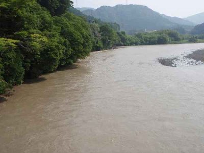 気田川は見たことのない、増水 コーヒー牛乳色。