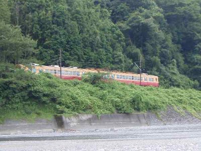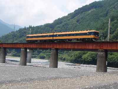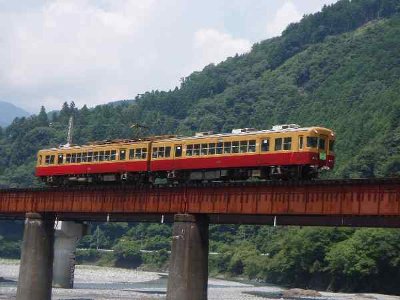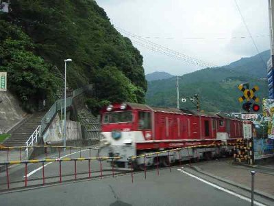 ![]() 千頭駅近くの踏み切りを通過する井川線 |