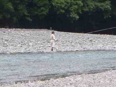 3本ブリッジを過ぎた左岸に、歩く釣り人発見 鮎ではなく、渓流釣りだ、 竿を出す前に通過できた。