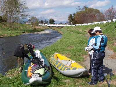 カヌーを組立て、回送用にMyJeepを犀川上陸地点 マレットゴルフ場川原へと置く