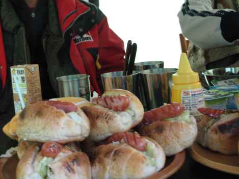 タープの中で、もけけっちさんが、ホットドッグを作り、朝食。