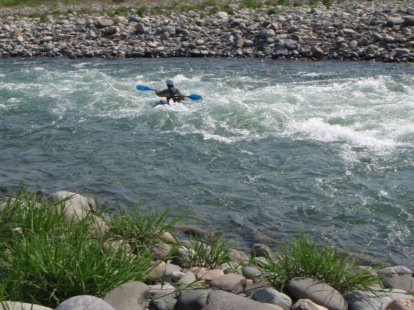 しばらく下り、このコース最後の難所 右岸へと本流がぶつかり左カーブする瀬である。