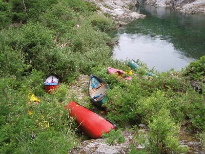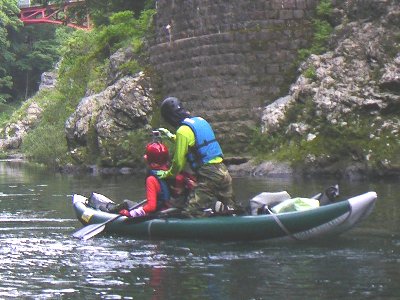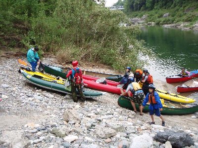 発電所下の川原へ艇を運び降ろす。 これが、なかなか、大変なのです。 |