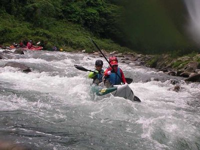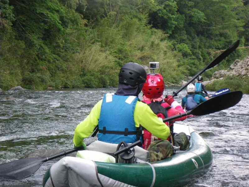 今回の試み、 デジカメをヘルメットに装着し、瀬で漕ぎながら、動画を撮影 ;肉丸さん撮影 |