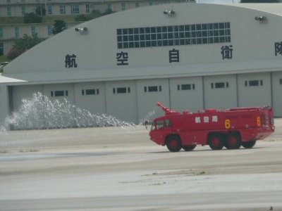 暑さからか、那覇空港で、水まきをしていた自衛隊車輌 |