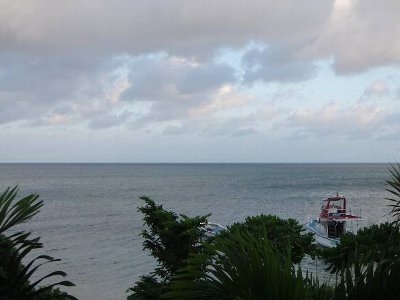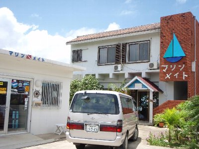 ![]() マリンメイト 到着 左が事務所、正面が食堂、その奥に宿泊棟、その先ビーチ |