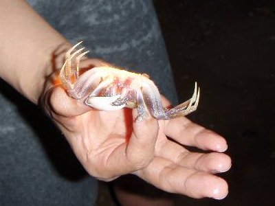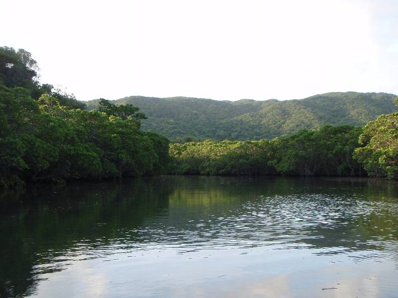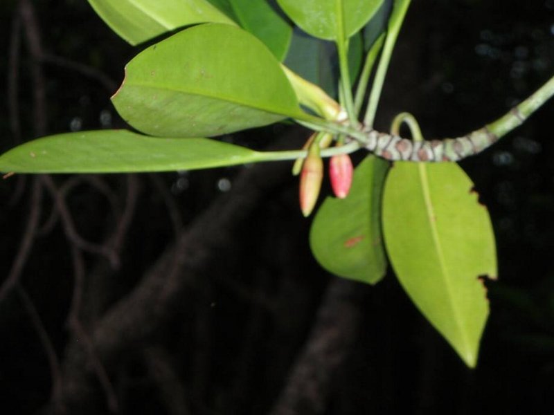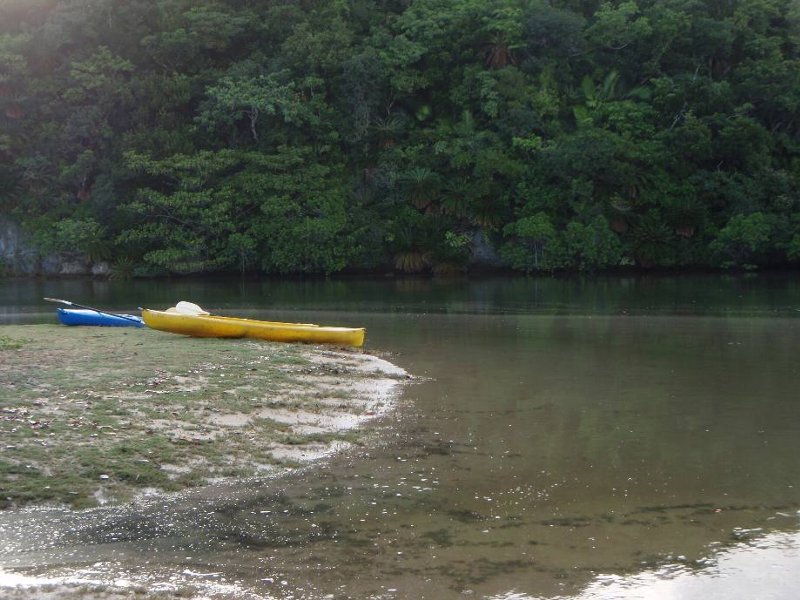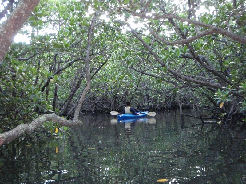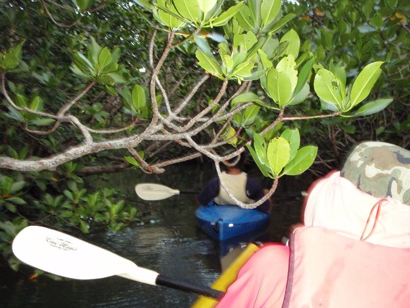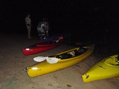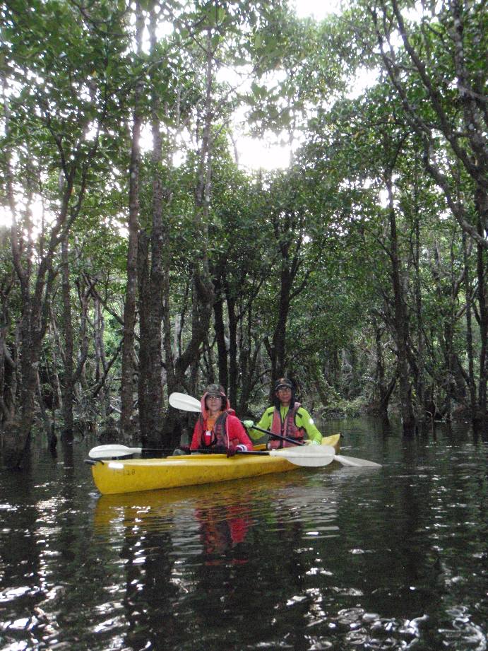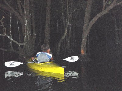 川に入る、真っ暗なので、海中電灯を付けて漕ぐ、マングローブが濃くあり、 頭をかわしながら進む。