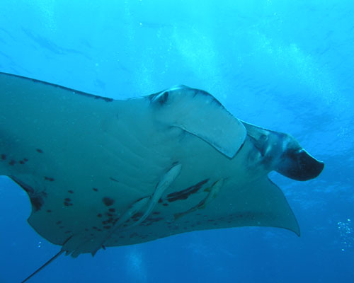 ゆくりと泳ぎ回り、私達の頭上数メートルに近づく、 息を止め、泡がマンタに当たらないよう様に注意する。