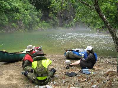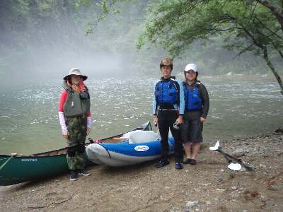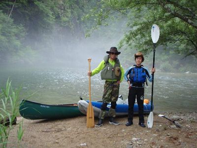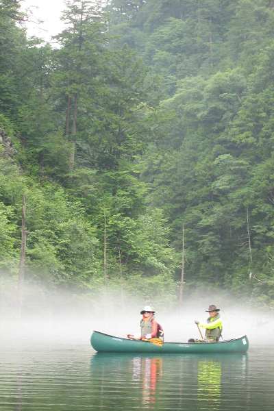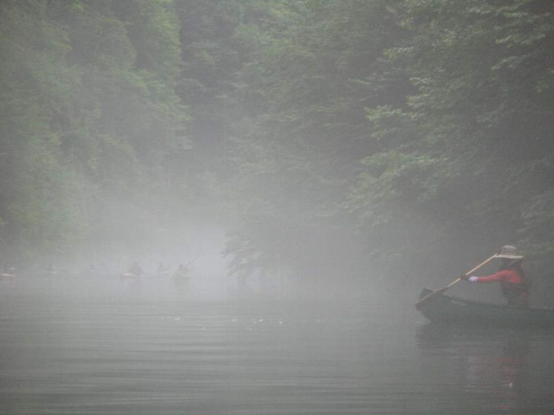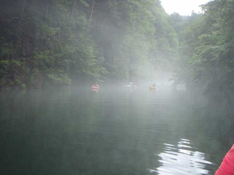 帰りのもやのなか、 カヌーツアーの人たちとすれちがう、