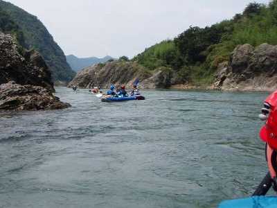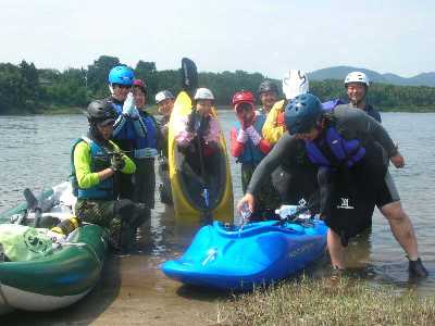 流れてしまい、やむなくカヤック艇も次の瀬を越えて右岸へと集合。