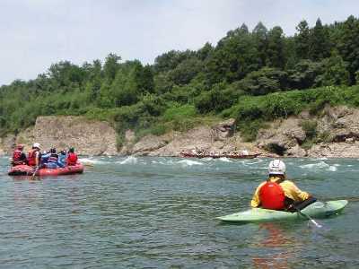 遊船の通過を待つ、カヤック、ラフトボート |