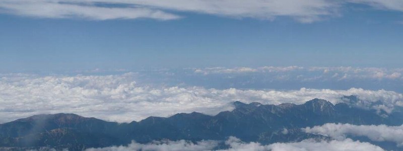 台風の影響で、上空の風が強く、低めの高度で飛行機は飛んでいく、 山が近くに見える。 |