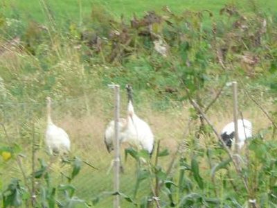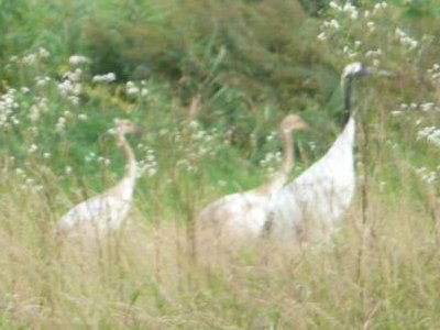 車を止め、近づいてみると、親子四匹である。 首が茶色なのが、子供の鶴