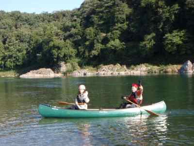 ![]() 上流へ漕ぐ、カナディアン 2艇 |