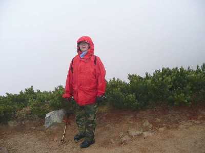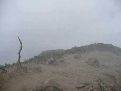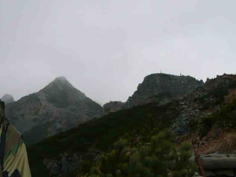 独標山頂の標が見え、 あと、20分くらいか の所で、又、雨、いや、氷の粒が降ってきた、今度は止まない。
