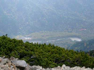 眼下には、上高地 河童橋の駐車場などが見えた |