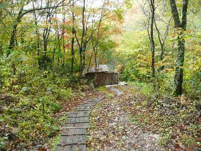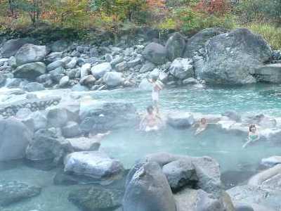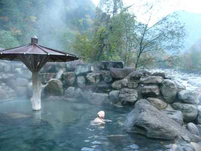 7:45からの朝食後、 橋を渡って対岸の貸切露天風呂へ、 そして、 だれもいないので、混浴大露天風呂へもはいる。