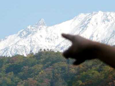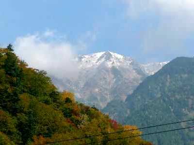 9時すぎに、チェックアウト、 のんびりと走行、 道沿いにあった宿、槍の郷の駐車場から 槍ケ岳の写真を撮る。