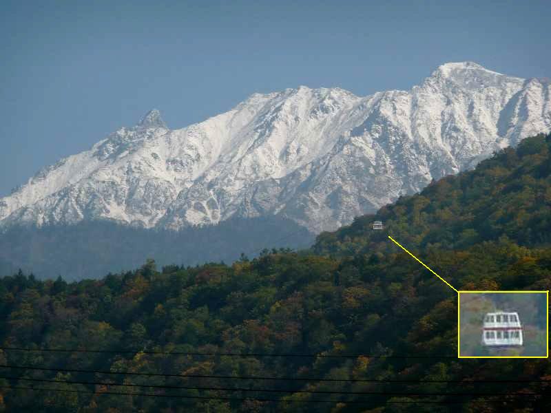 鍋平駅から西穂高口駅への、2階立てのロープウェイ・ゴンドラが見えた。 |