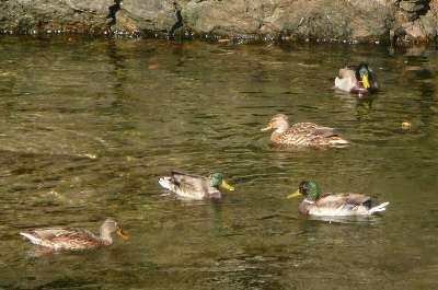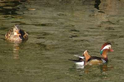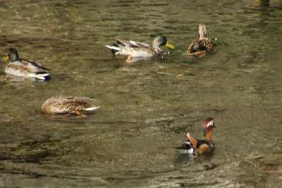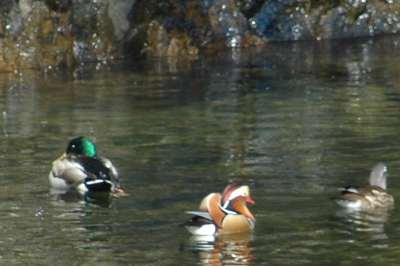 しかし、鴨の中に、1羽の違う色の鳥が・・・・・、 オシドリだ!