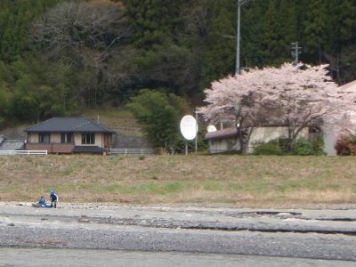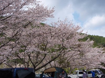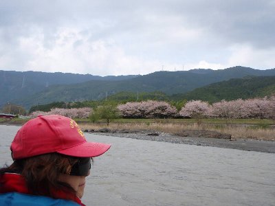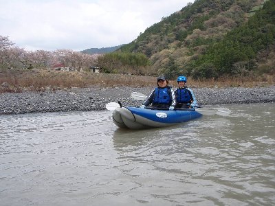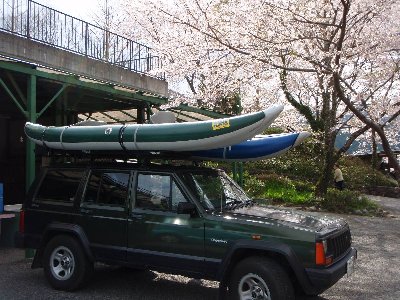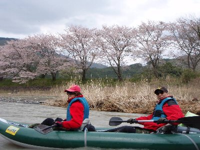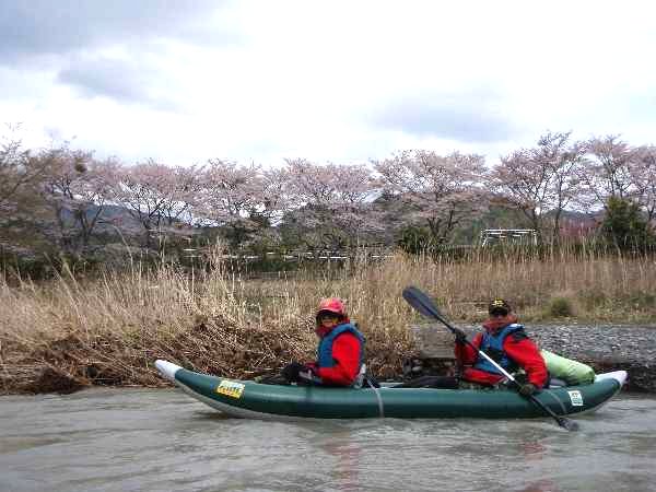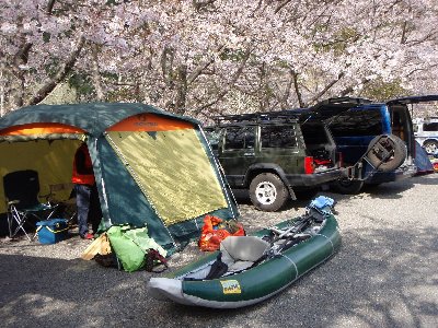 ヤマネコ2号、桜の下で組立て、上流へと向かう