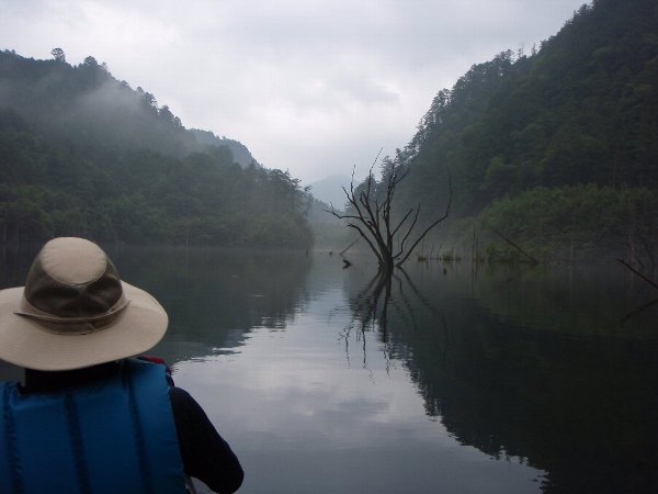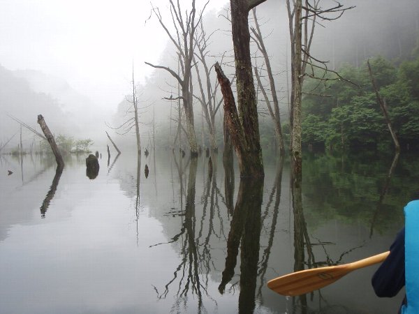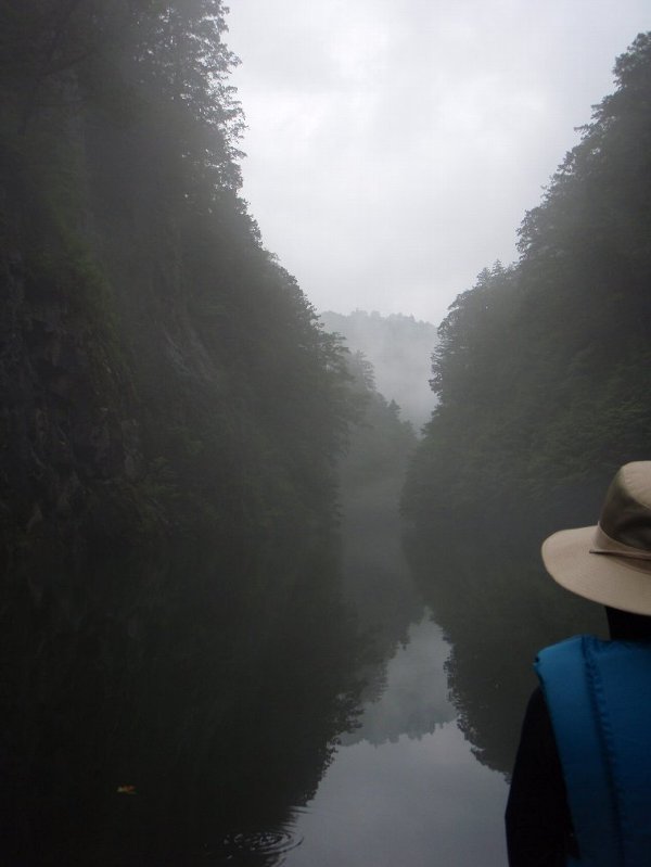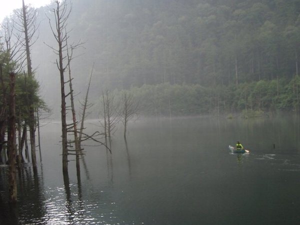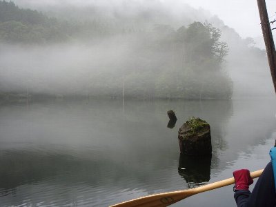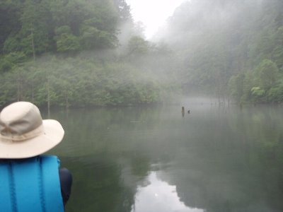 靄の中、自然湖へと漕ぎ出す、 まずは最深部へ 途中雨がぱらついたが、気になるほどでもなく、最深部へ。