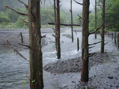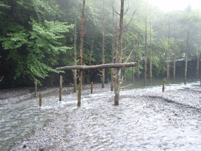 橋をくぐり、流れ込み部へ、前回より水が多い、 立ち木に、流木が乗り 鳥居のようになっていた。