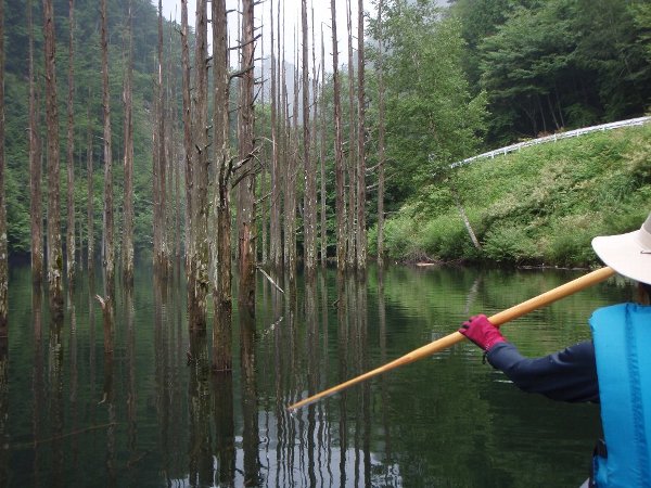岸沿いをスタート地点方面へと漕ぐ、ゆっくりと、立ち木のなかをスラローム