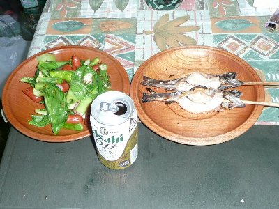 岩魚の塩焼きで、ビール(プリン体OFFである) |