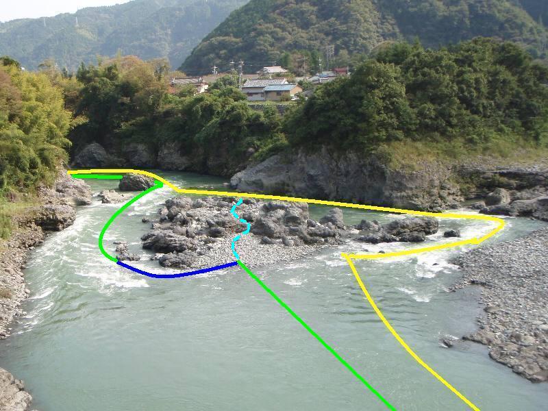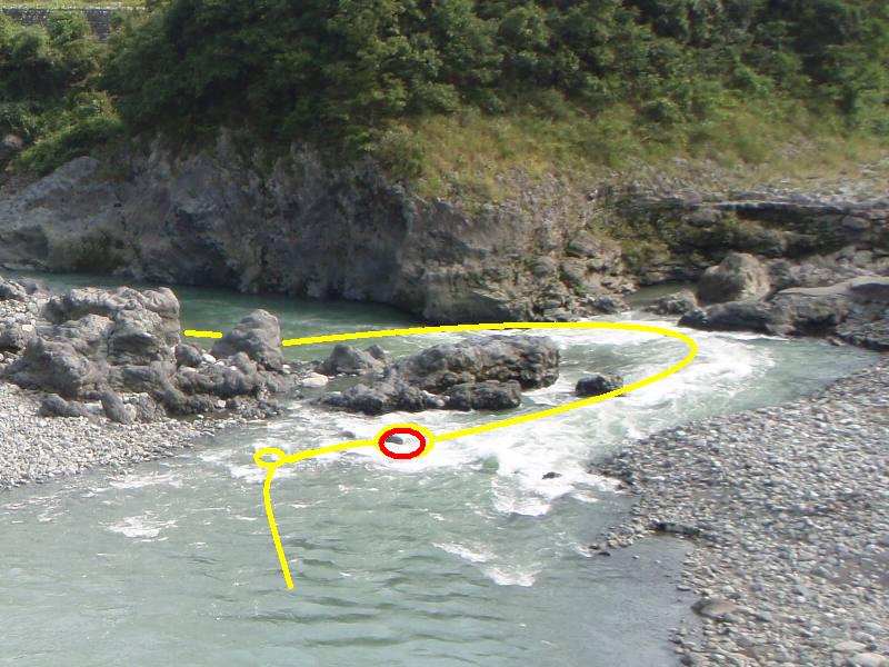 | 釜口の瀬 通過コース 緑;素浪人そのT 黄色;素浪人そのU . 記述、素浪人T 艇につかまったまま流され 瀬をすぎると、友人艇がかみさんの近くにいる事が見えた。 肩の力が抜けて 安心した。 流され瀞場に浮いている一本のパドルを回収した。 . |