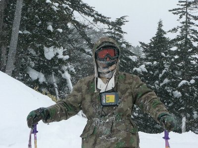 午後は、 雪が多く降ってきた。 フードをかぶる。 |
