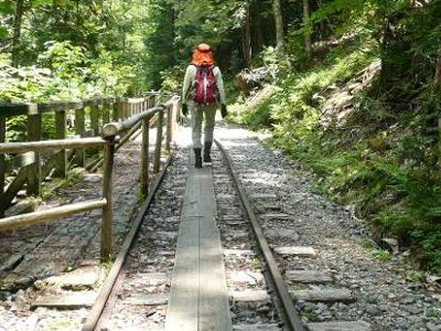 今は使われていない軌道を歩く |