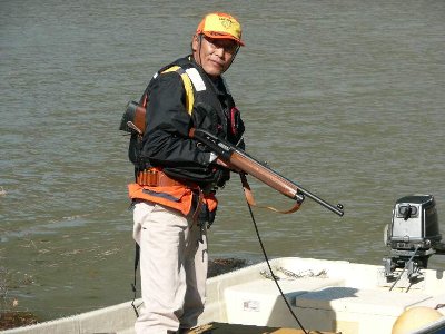 撤収作業をしていたら、猟師が船で上陸。 獲物の鹿を積んでいた。 |