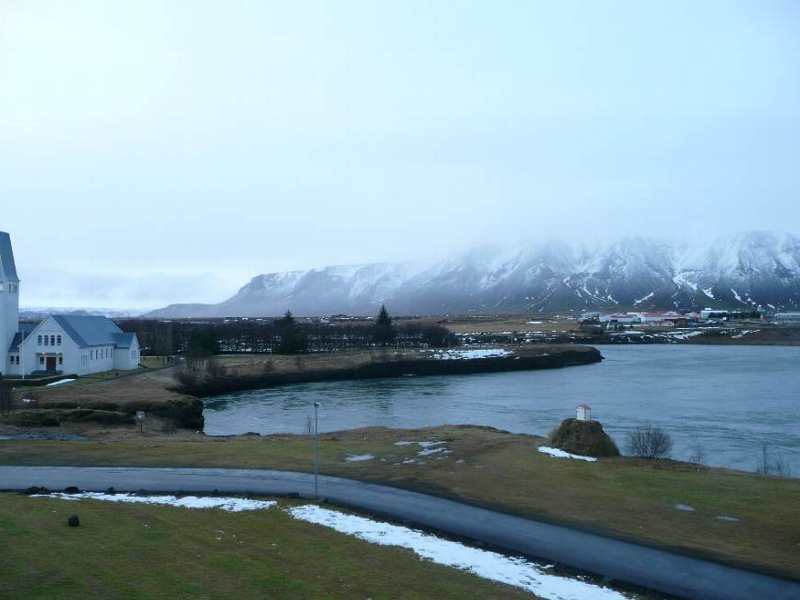 ![]() 私達二人の間に見える白いポールが、国旗掲揚台で、民主議会「アルスング」が開かれた場所。 |