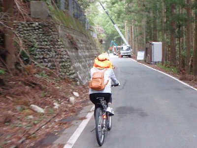 川沿いの道で、山崩れによる流木の復旧作業が行われていた。