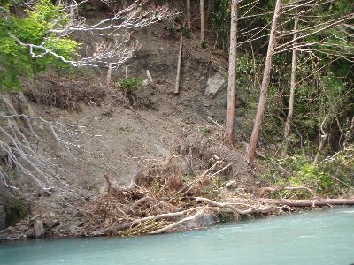 ![]() 崩壊、倒木が川の中へ入っている箇所もある。 |