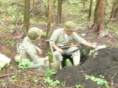 降ったり、止んだり、突然強く降ったりの雨の中、延々と塹壕掘りが続く。