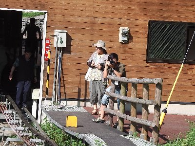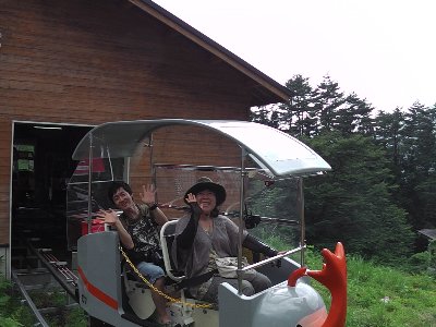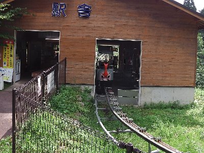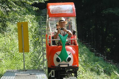 駅舎に到着 カブトムシ型の2人乗りモノレール |