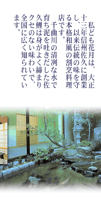 長寿地蔵尊で有名なぴんころ地蔵の斜めむかいにある 『花月』は、鯉料理を【佐久の味】として定着させた老舗中の老舗。 創業大正十三年以来、 鯉・川魚料理に古いのれんと伝統の味を守る本格的和風割烹料亭だ。 一品ひとしなに食材の持ち味を活かした鯉料理の数々はさすが老舗の味で、 様々な著名人が訪れている。 「鯉が苦手な方でも帰り際に、美味しくいただけました、 とおっしゃるお客様が大勢いるんですよ」と名物女将が語るとおり、 クセのない鯉本来の旨みが味わえる。